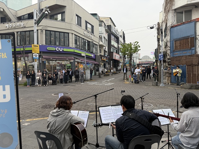 서귀포시가 지난 11일 명동로 거리에서 공직자 기타동호회 '퐁낭'과 밴드동호회 '메아리'가 함께하는 버스킹 공연을 개최했다.