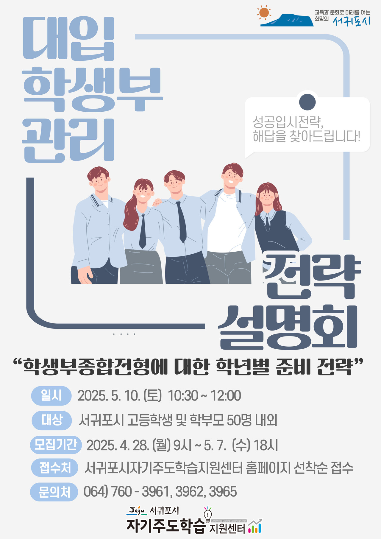 성공적인 대입을 위한 서귀포시역 고등학생 및 학부모 대상의 ‘대입 학생부 관리 전략 설명회’가 오는 5월 10일 서귀포시 자기주도학습지원센터에서 개최된다.