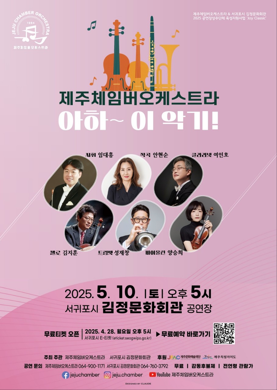 서귀포시 김정문화회관이 2025년 공연장 상주단체 육성지원 사업의 첫 번째 기획 공연으로 제주체임버오케스트라의 ‘아하~이 악기!’를 오는 5월 10일 오후 5시에 개최한다.