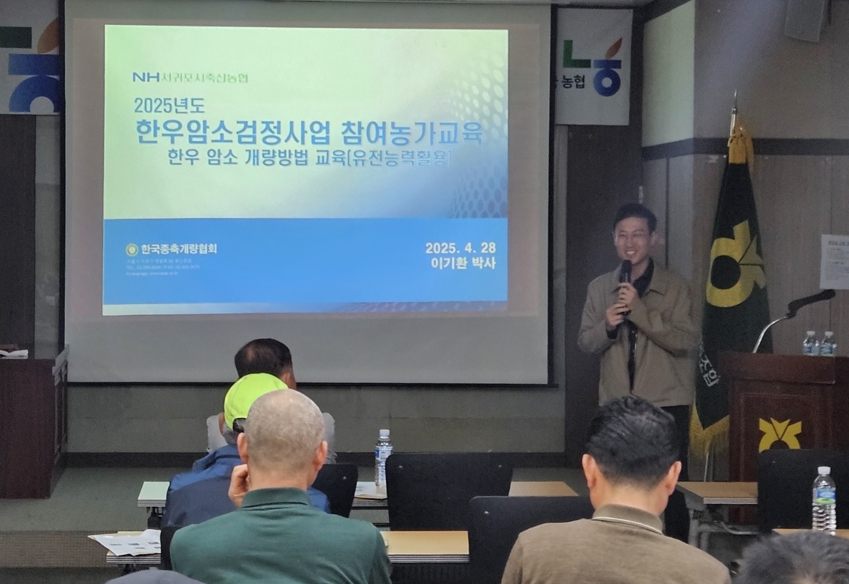 서귀포시축산농협(조합장 김용관)은 지난 4월 28일 암소검정사업 참여 농가를 대상으로 '암소검정사업 설명 및 유전능력평가를 활용한 한우 개량' 교육과 1:1 맞춤형 컨설팅을 진행했다.