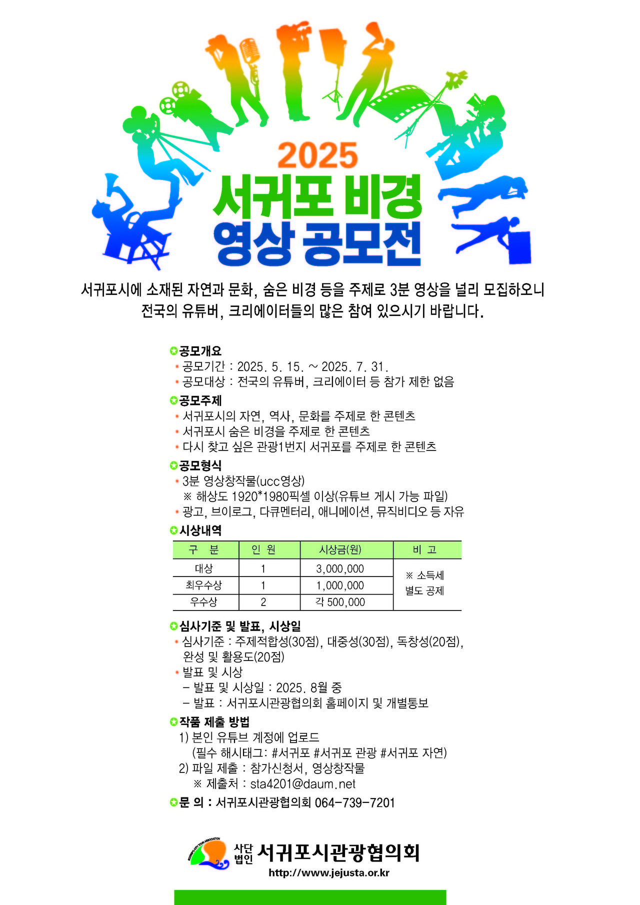 작품 제출 방법으로는 본인 유튜브를 통해 업로드한 후 별도 파일을 제출하면 되며, 자세한 사항은 사)서귀포시관광협의회(064-739-7201)로 하면 된다.