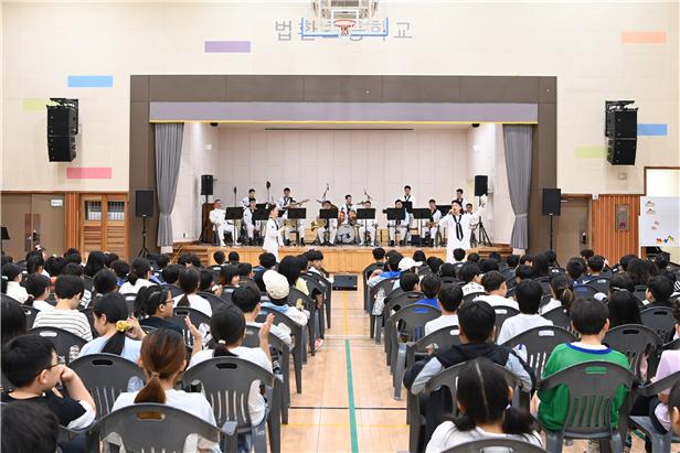 해군 기동함대 군악대는 3일 서귀포시 상효동 성요셉요양원, 15일에는 법환동 법환초등학교를 찾아 맞춤형 연주회를 진행했다.