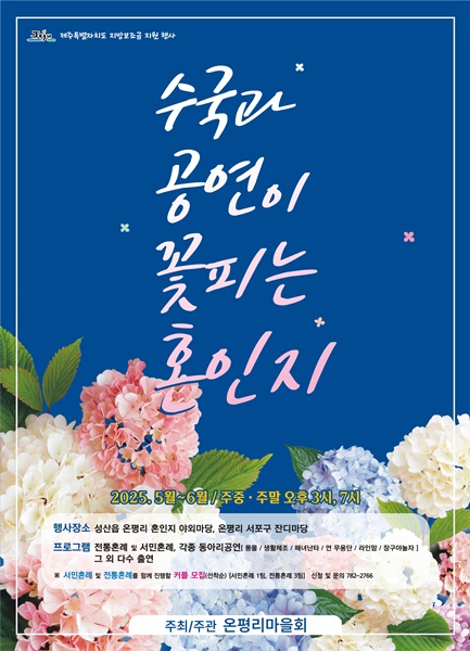 서귀포시 성산읍 온평리마을회(이장 강대훈)가 오는 5월 30일부터 6월 15일까지 매주 금·토·일 '수국과 공연이 꽃피는 혼인지' 행사를 개최한다고 밝혔다.