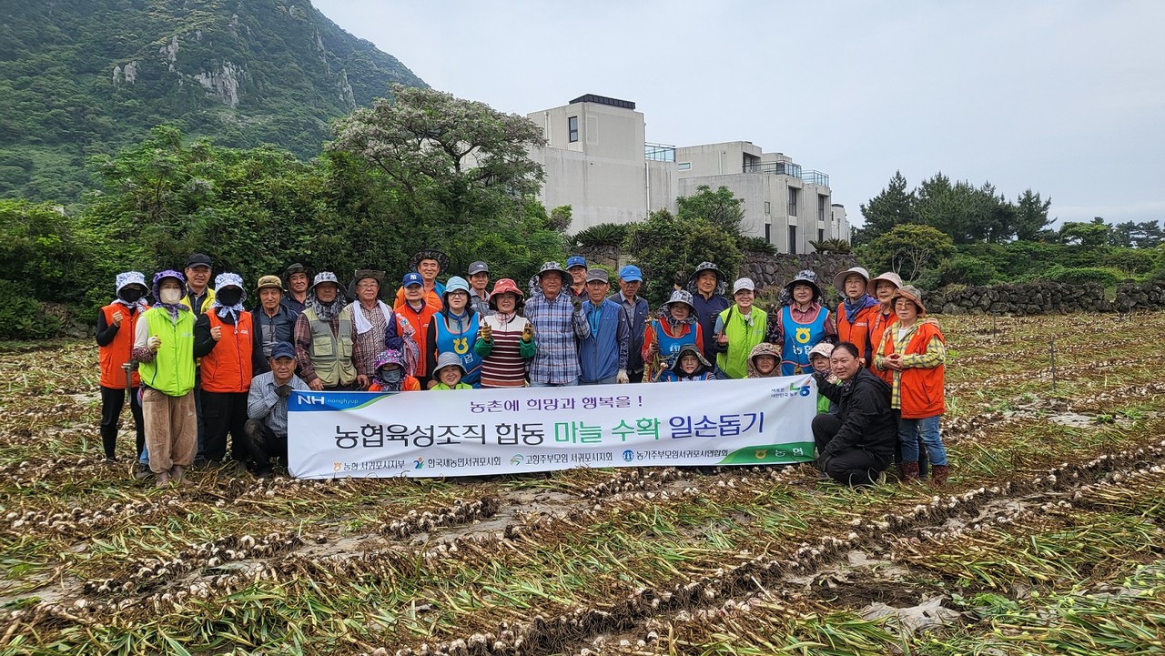 농협중앙회 서귀포시지부(지부장 강대규)가 농협 육성조직과 함께 지난 23일 안덕면 사계리 마늘 포전에서 합동 수확작업을 펼쳤다.