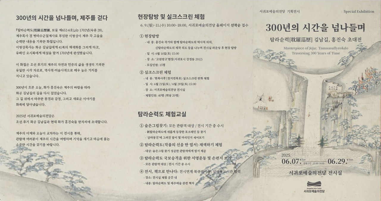 서귀포시는 올해 '제주 국가유산 방문의 해'를 맞이해 제주의 대표 문화유산 '탐라순력도'의 역사·문화적 가치를 시민, 관광객에게 널리 알리기 위해 오는 29일까지 한 달간 서귀포예술의전당에서 '300년의 시간을 넘나들며, 탐라순력 김남길, 홍진숙' 초청 기획전시를 개최한다.