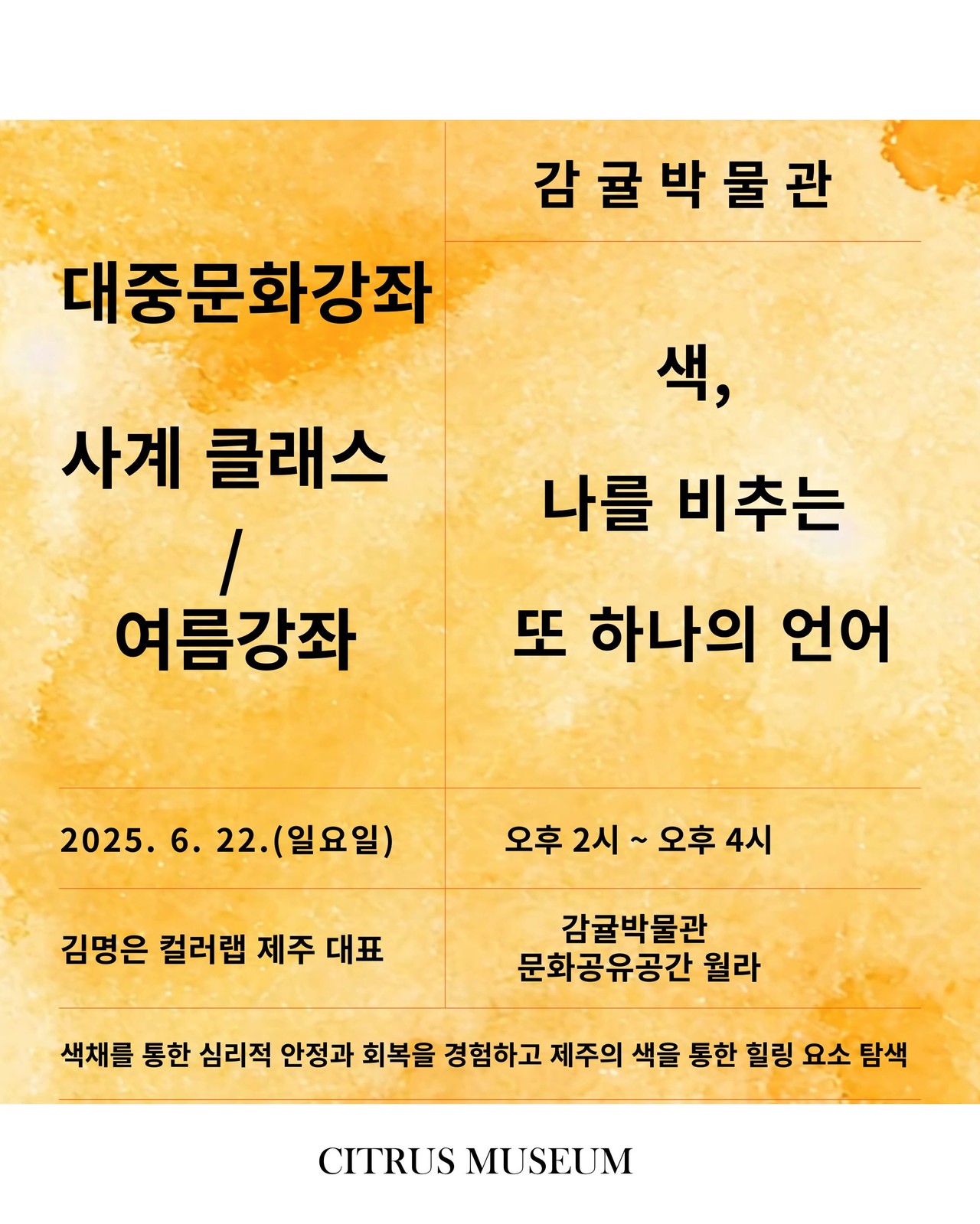 서귀포시가 감귤박물관 개관 20주년을 기념해 마련한 대중문화 강좌 '사계클래스'의 두 번째 강좌 '색, 나를 비추는 또 하나의 언어'를 오는 22일 감귤박물관 문화공유공간 '월라'에서 개최한다.
