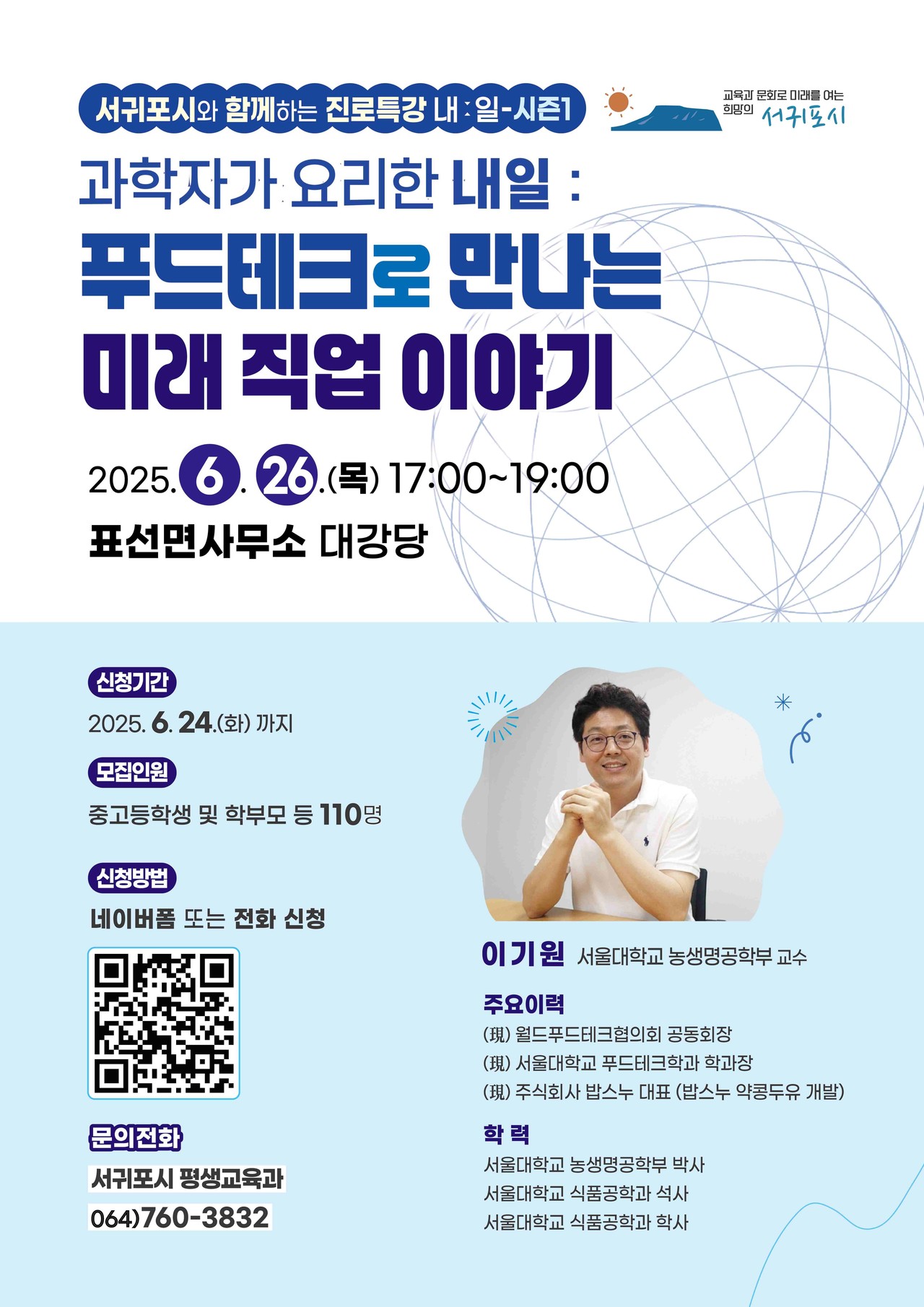 오는 26일 오후 5시에는 표선면사무소 대강당에서 서울대 농생명공학부 이기원 교수가 '과학자가 요리한 내일: 푸드테크로 알아보는 미래 직업 이야기'를 주제로 특강을 진행한다.