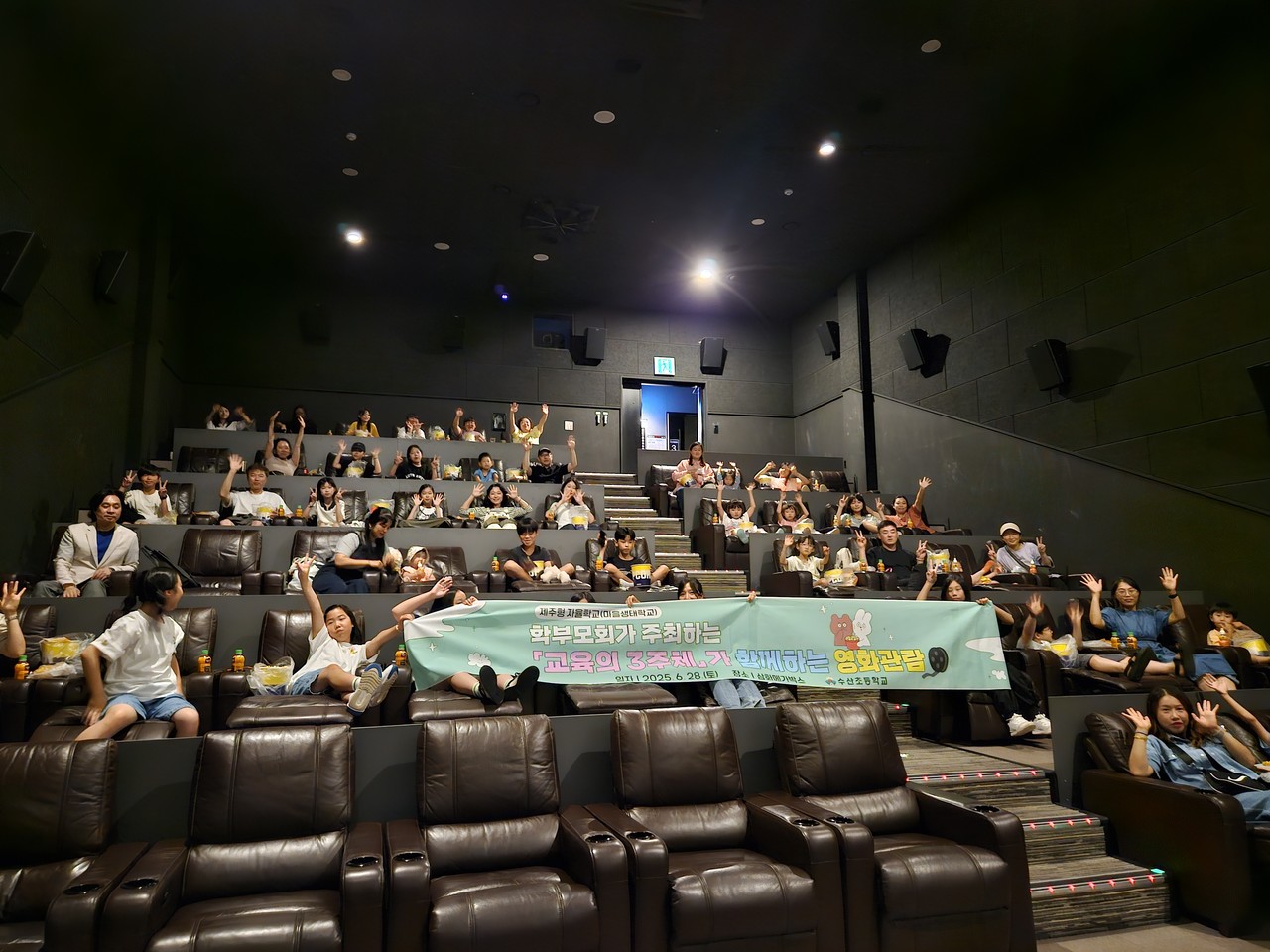 수산초등학교(교장 김경화)는 지난달 28일 제주시 지역 영화관에서 유치원부터 6학년 어린이와 가족 등 100여명이 참석한 가운데 ‘교육의 3주체가 함께하는 체험 프로그램’의 일환으로 가족과 함께하는 영화관람 활동을 진행했다.