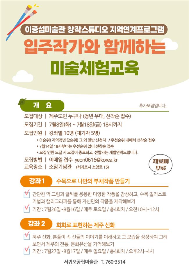 각 프로그램은 총 4회로 운영되며 탁동인 작가의 '수묵으로 나만의 부채작품 만들기', 이계나 작가의 '회화로 표현하는 제주신화' 수업에 각 10명씩 모집한다. 관내 거주하는 성인이면 누구나 신청 가능하다.