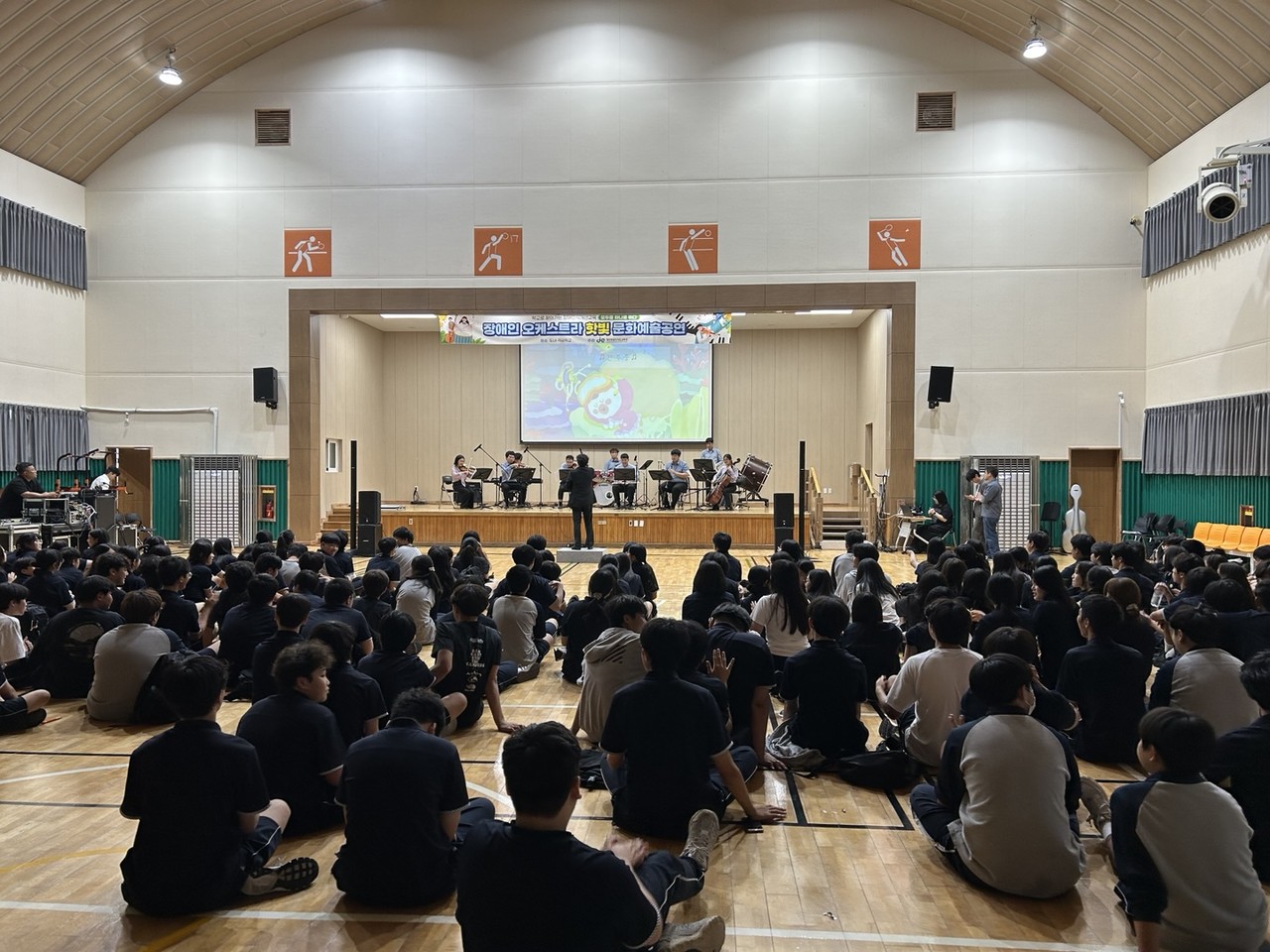남원중학교(교장 오경석)는 지난 11일 학교에서 전교생이 참석한 가운데 장애 인식개선 교육 ‘모두를 하나로 묶다’ 프로그램의 일환으로 제주도교육청 소속 ‘핫빛오케스트라’를 초청해 공연했다.