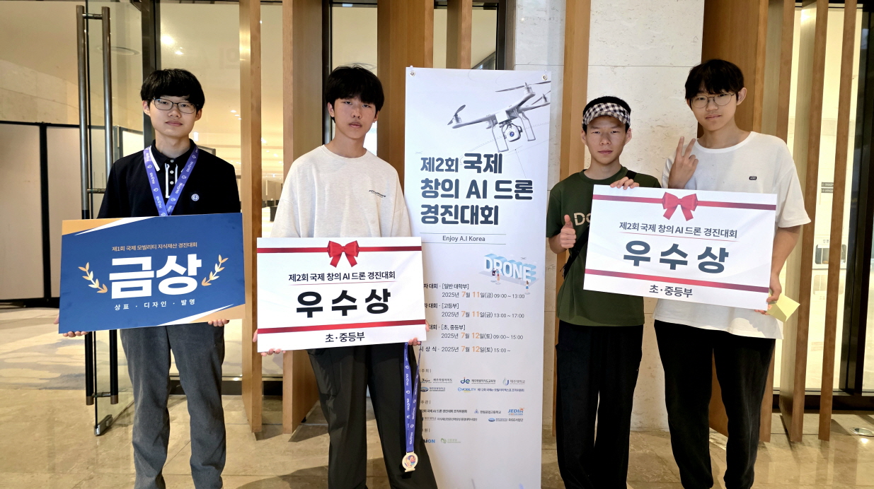 중문중학교(교장 고정상)는 지난 12일 제주신화월드에서 열린 제2회 국제 창의 AI 드론 경진대회’ 및 ‘제1회 국제 모빌리티 지식재산 경진대회’시상식에서 발명분야에서 1명이 금상을, 드론 분야에서 2팀이 우수상을 각각 받았다.