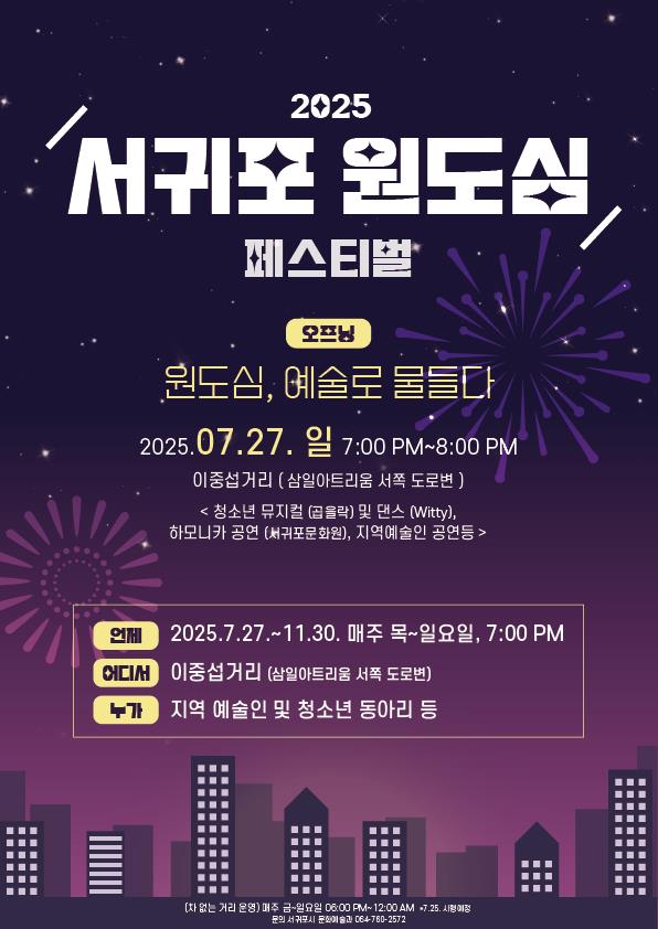 이중섭거리명동로 일대에서는 서귀포 원도심 문화페스티벌이 열린다. 7월 27일부터 11월까지 매주 목일요일 저녁 7시, 청소년과 지역 예술인이 참여하는 버스킹 공연이 총 60회 진행될 예정이다.