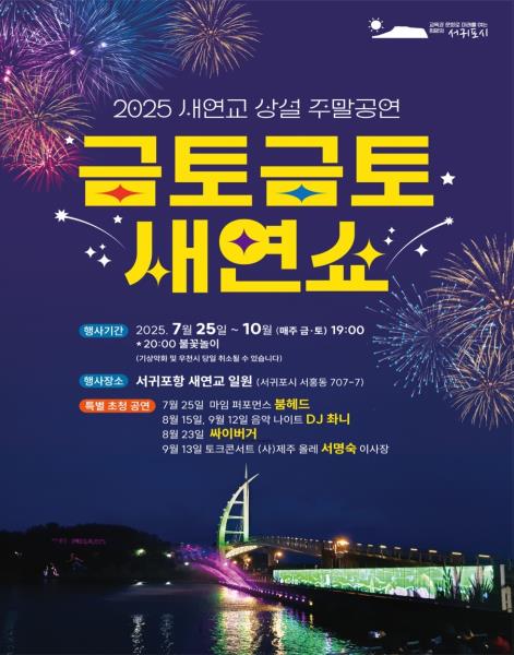 새연교 주말 문화공연 '금토금토 새연쇼'는 7월 25일부터 10월까지 매주 금·토요일 저녁 7시에 열린다.