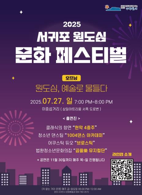 내일인 25일 새연교에서 '금토금토 새연쇼'와 불꽃쇼를 시작으로, 26일 이중섭로 '정방동 토토즐', 27일 원도심 문화페스티벌이 순차적으로 개막한다.