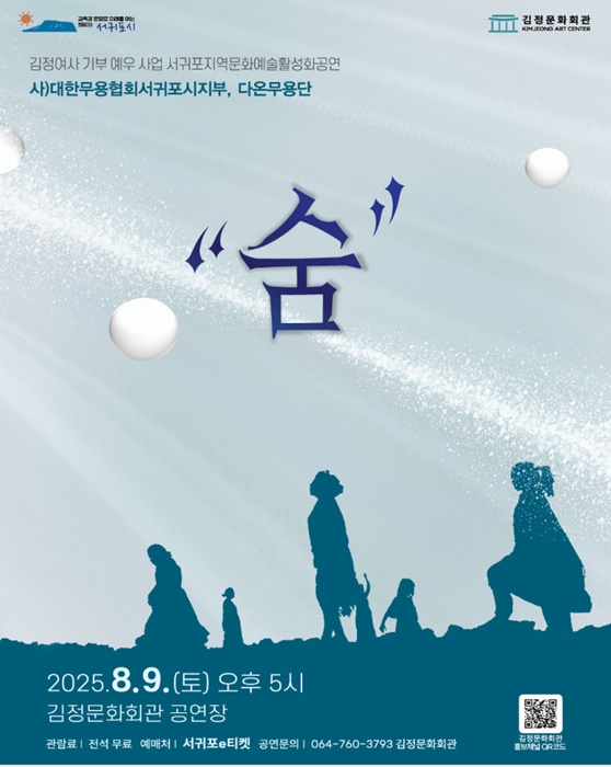 서귀포시가 김정여사 기부예우사업의 마지막 공연으로 무용공연 '숨'을 오는 8월 9일 오후 5시 김정문화회관에서 개최한다.
