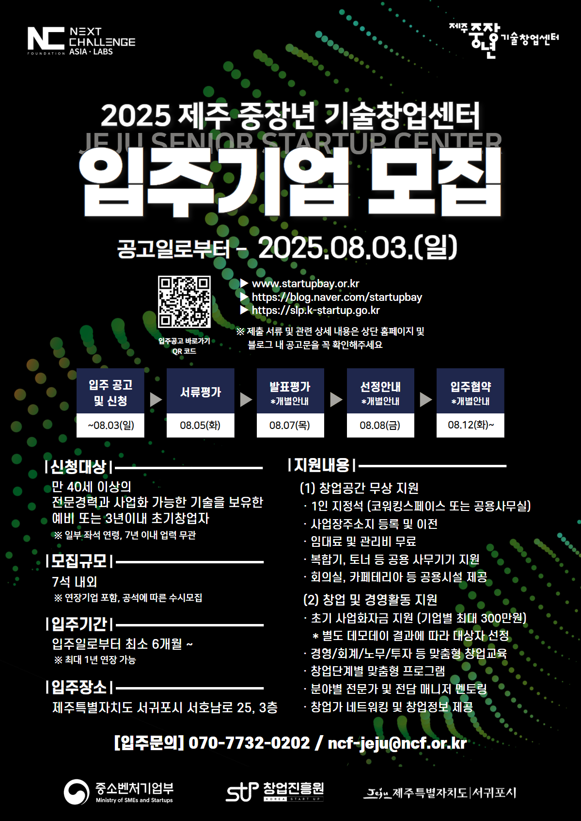 2025년 하반기 모집 대상은 7개팀 내외이며, 모집 공고 및 신청방법은 서귀포시 스타트업베이 홈페이지 혹은 K-Startup 창업공간플랫폼, 홍보 포스터 내 QR코드를 통해 확인할 수 있다.