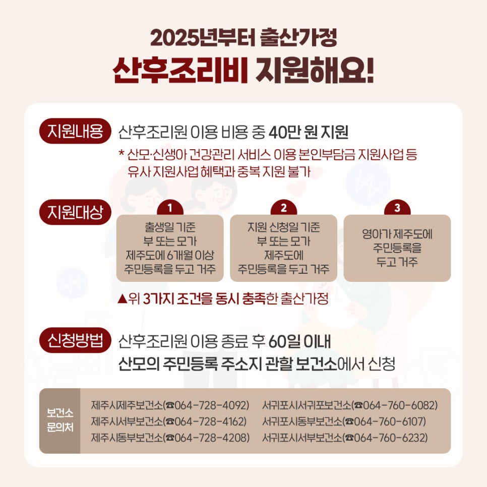 서귀포시 서부보건소는 출산 가정의 경제적 부담을 줄이고 건강한 출산 및 산후 회복을 지원하기 위해 2025년부터 산후조리원을 이용한 경우 최대 40만원까지 지원하고 있다.