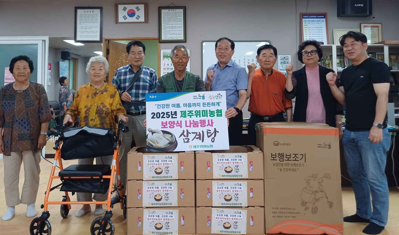 위미농협(조합장 현재근)은 지난 10일 서귀포시 남원읍 하례2리 노인회관에서 지역 어르신 50여명이 참석한 가운데 ‘보양식 나눔 및 보행보조기 전달 행사’를 실시했다.