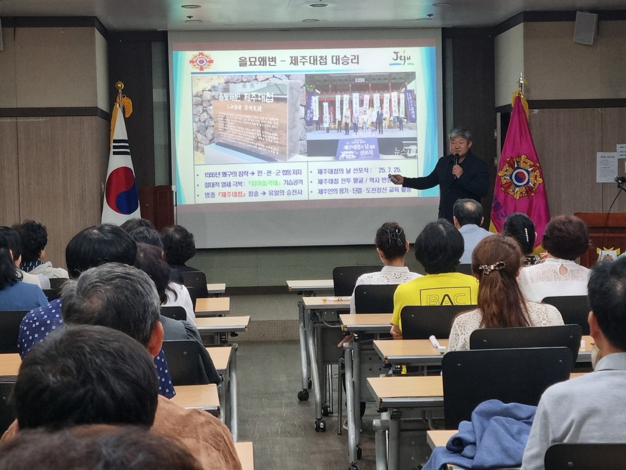 서귀포시재향군인회(회장 현종우)는 지난 13일 흑한우 명품관 세미나실에서 회원 120여 명이 참석한 가운데 안보 강사를 초빙해 “애국의 땅 평화의 섬 제주”라는 주제로 안보강연회를 개최했다.