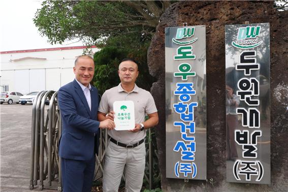 서귀포시 하효동에 소재한 도우종합건설(주)(대표이사 강두원)은 지난 14일 초록우산 서귀포시후원회(회장 박성현)와 초록우산 제주지역본부(본부장 김희석)가 진행하는 나눔릴레이 캠페인에 동참했다. 서귀포 지역 아동을 위한 후원에 동참하며 나눔현판 전달식도 진행됐다.