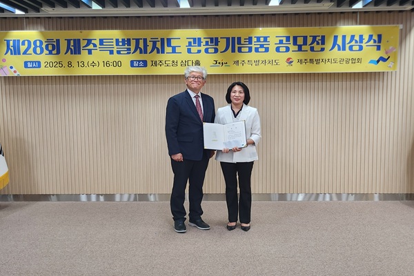 서귀포시니어클럽(관장 이은경)에서 운영 중인 지역특화 노인일자리 사업단 ‘숨비소리’가 지난 13일 제주특별자치도 1청사 삼다홀에서 열린 '제28회 제주특별자치도 관광기념품 공모전' 시상식에서 실용기념품 부문 프리미엄상(제주특별자치도지사상)을 수상했다.
