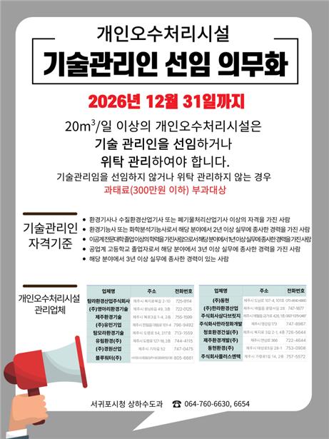 서귀포시가 개인오수처리시설 기술관리인 선임 대상 확대를 앞두고 홍보에 나선다고 28일 밝혔다.