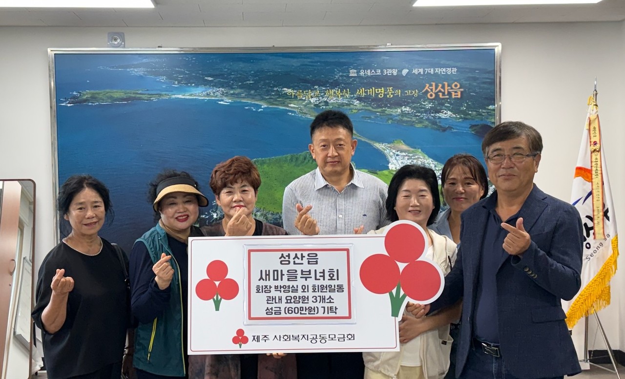 서귀포시 성산읍새마을부녀회(회장 박영실)는 지난 26일 성산읍(읍장 김경범)을 방문해 성산읍 지역에 위치한 미타요양원, 한마음요양원, 성산원광소규모요양시설 등 총 3곳에 전달해 달라며 성금 60만 원을 기탁했다.