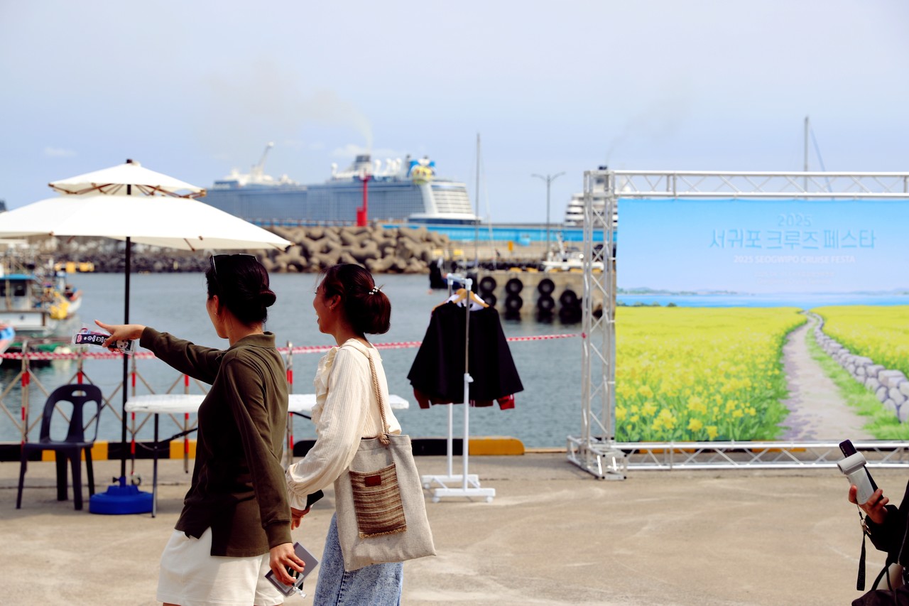 서귀포시가 크루즈 기항지 이미지 제고와 관광 활성화를 위해 지난달 30일부터 11월까지 강정크루즈항 일대에서 ‘2025 서귀포 크루즈 페스타’를 운영하고 있다. 크루즈 관광객이 행사장을 지나고 있다.