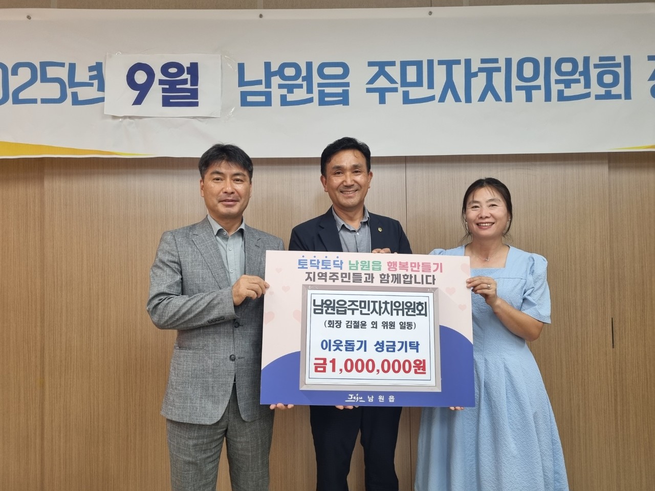 김철윤 주민자치위원장은 “소외되고 어려운 이웃에게 조금이나마 도움을 드리고자 남원읍 주민자치위원들과 성금을 마련했다”며 “앞으로도 꾸준한 나눔과 봉사를 통해 행복한 남원읍을 만드는데 앞장서겠다”고 전했다.