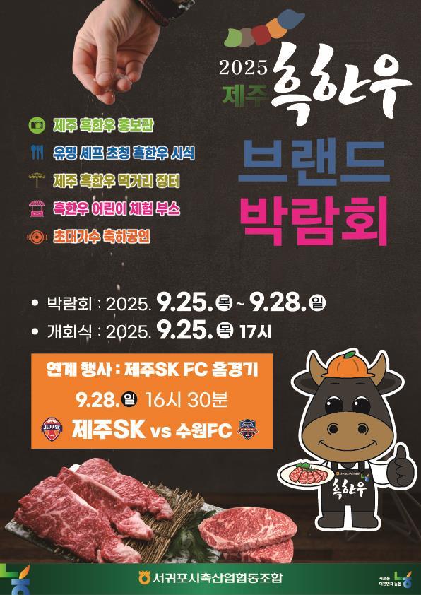 서귀포시는 추석 명절을 앞두고 제주 흑한우의 가치를 알리고, 소비촉진을 통해 지역 축산업과 경제 활성화 기여를 목적으로 오는 25일부터 28일까지 4일간 제주월드컵경기장 광장에서 '2025 제주 흑한우 브랜드 박람회'를 개최한다고 밝혔다.