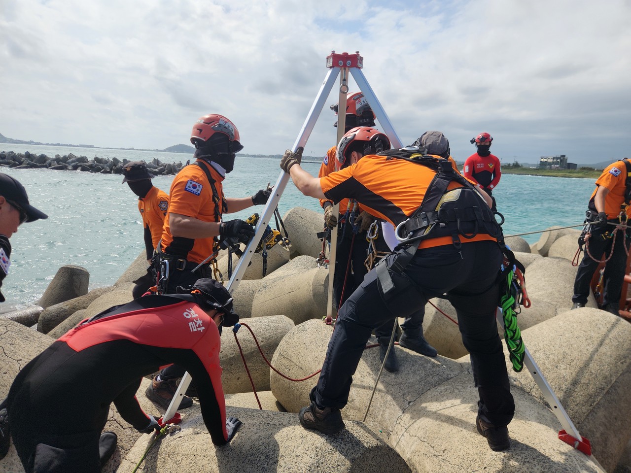 이번 합동훈련은 서귀포해양경찰 구조대와 제주동부소방서 구조대 인원 총 15명이 참여했으며, △테트라포드 추락자 합동 대응 △구조보트 활용 구조 훈련 △동력구조보드 이용 인명구조 훈련 등 기관별 구조 기법 공유를 통해 구조역량 강화와 사고 대응 협력 체계 구축에 목적을 두고 진행됐다.