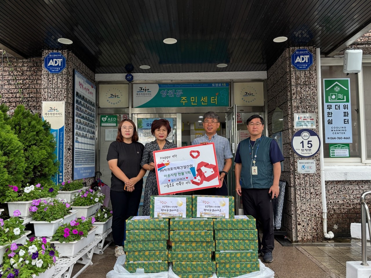 ㈜서귀포석재건설사업(대표 안정민)은 지난 24일 영천동주민센터(동장 오창림)를 방문해 추석맞이 이웃사랑 물품 멸치세트 20상자(90만원 상당)를 전달했다.