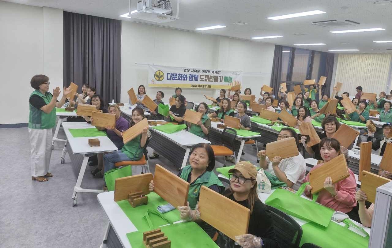 이날 대정읍새마을부녀회원과 다문화 결혼이주 여성들은 사포질, 마감 처리 등 자신만의 도마를 만드는 시간을 보내고, 평소 접하기 어려운 목공예 활동으로 가족 소통과 협력을 자연스럽게 이끌어 내는 뜻깊은 경험을 가졌다.