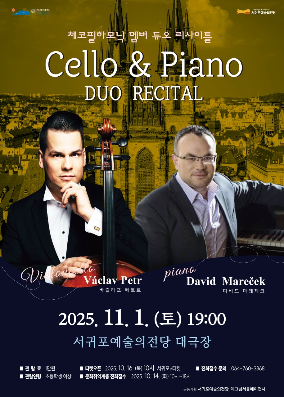 서귀포시는 오는 11월 1일, 서귀포예술의전당 대극장에서 체코필하모닉오케스트라 멤버 ‘첼로 & 피아노 듀오 리사이틀’을 개최한다고 밝혔다.
