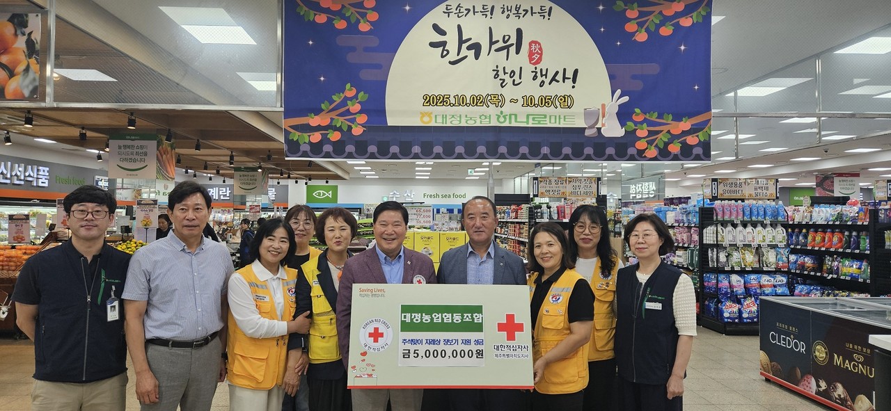 대정농협은 민족 최대 명절 추석을 맞아 지역 사회의 어려운 이웃에게 따뜻한 마음을 전하기 위해 지난 1일 대한적십자사 제주특별자치도지사에 추석맞이 차례상 장보기 지원금 500만 원을 전달했다.