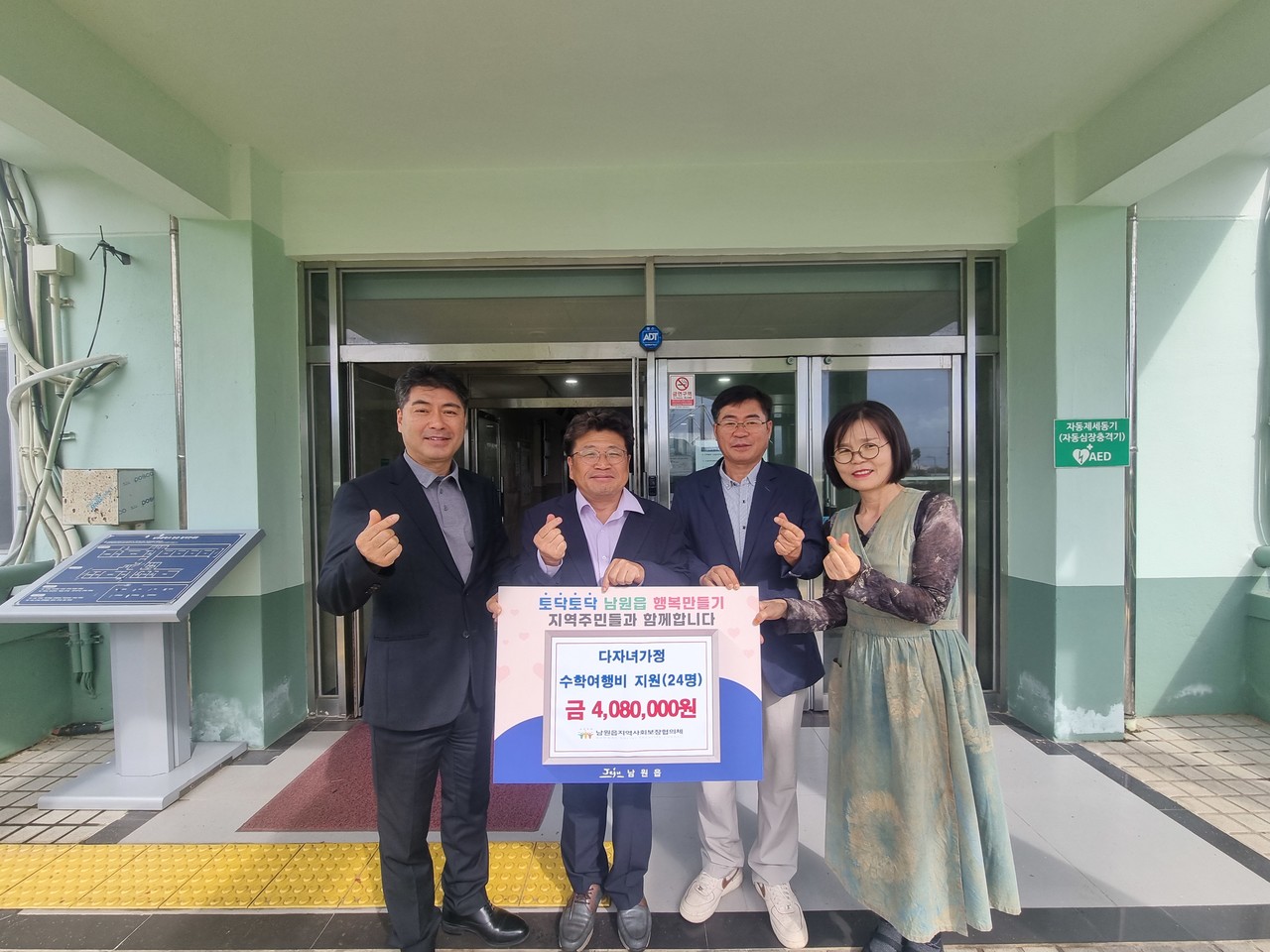 서귀포시 남원읍지역사회보장협의체(공동위원장 김기창, 고권우)는 지난 16일 남원읍 지역복지 특화사업인 ‘2025년 토닥토닥 남원읍 행복만들기’의 일환으로 다자녀가정 학생 24명의 수학여행경비 지원을 실시했다.