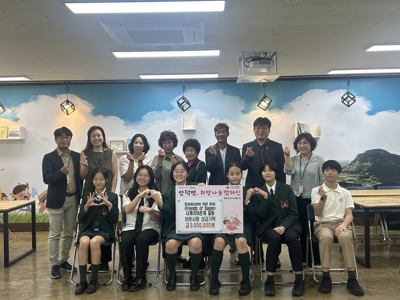 서귀포시 안덕면(면장 김태유)은 지난 17일 브랭섬홀 아시아(BHA) 국제학교의 봉사동아리‘프렌즈 오브 사계(Friends of Sagye)’(회장 하유정)와 사계리어촌계(계장 김기범)가 지역 내 어려운 아동·청소년을 위해 사용해 달라며 기부금 300만 원을 전달했다고 밝혔다.