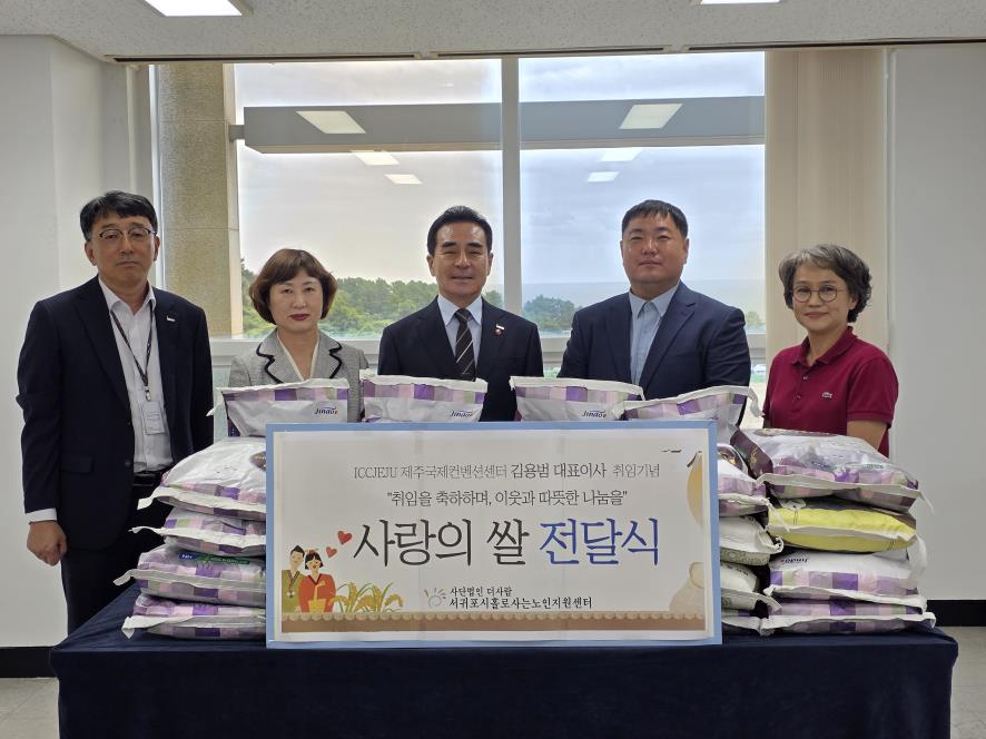 제주국제컨벤션센터(대표이사 김용범)는 최근 서귀포시홀로사는노인지원센터를 방문해 김용범 대표이사 취임식 때 받은 쌀 화환 등을 전달했다.