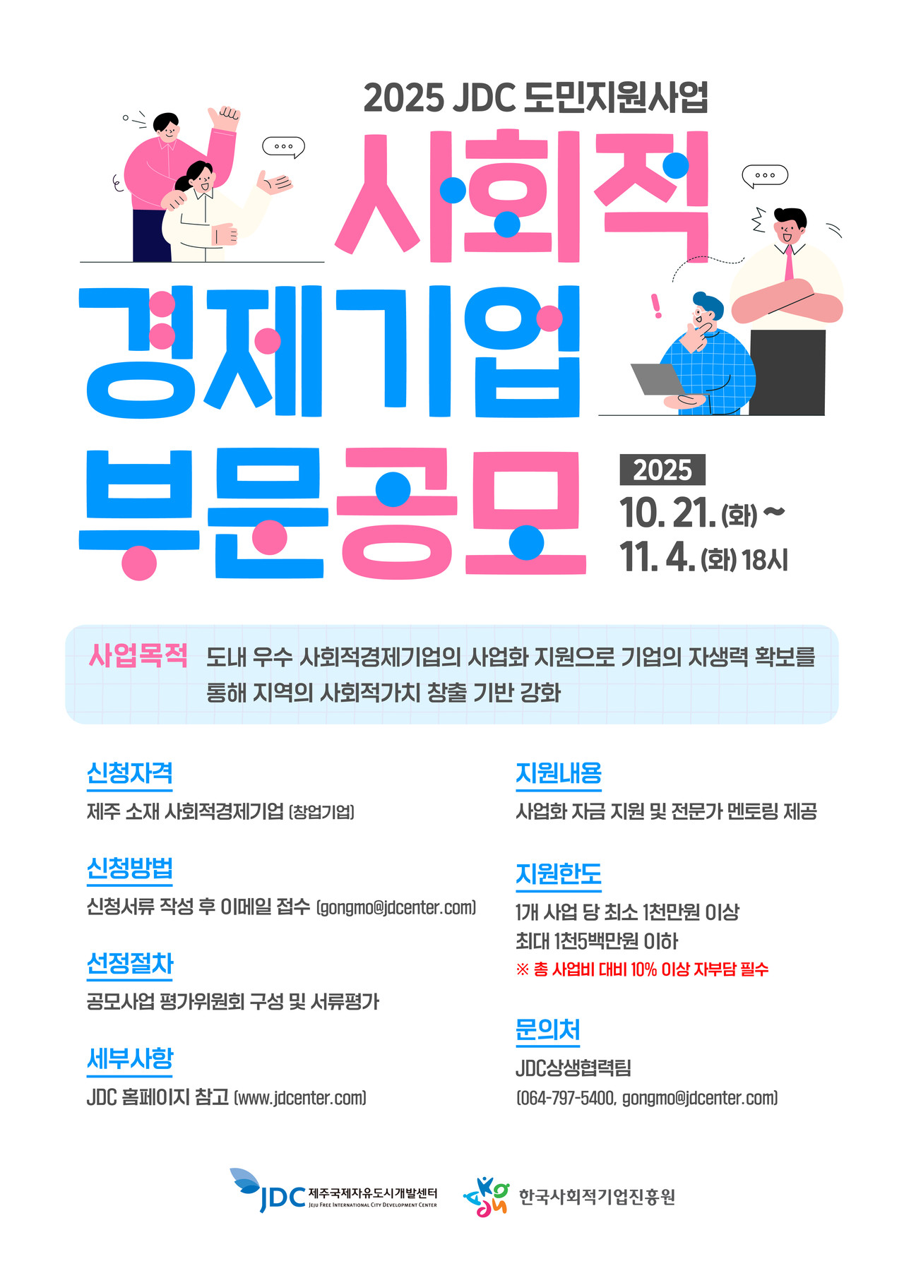 제주국제자유도시개발센터(이사장 직무대행 곽진규, 이하 JDC)는 제주 지역의 사회적가치 창출 기반 강화를 위한 '2025년 도민지원사업 사회적경제기업 부문 공모'를 오는 11월 4일까지 실시한다고 밝혔다.
