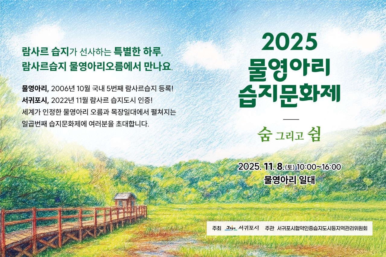 서귀포시와 서귀포시 협약인증습지도시등 지역관리위원회(위원장 김재종, 고권우)는 오는 8일, 남원읍 물영아리 목장 일대에서 ‘물영아리 습지문화제, 숨 그리고 쉼’을 개최한다.