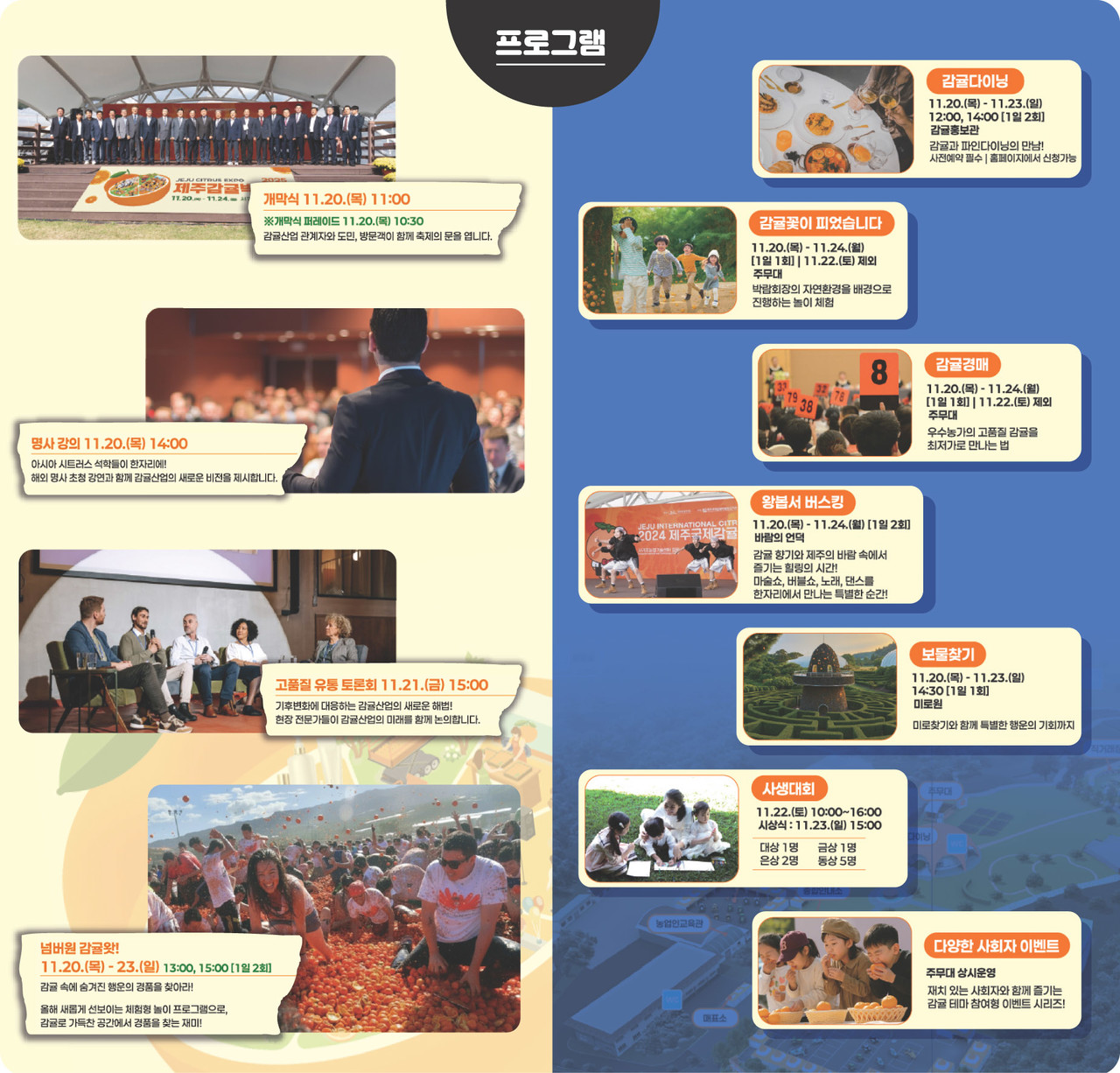 특히 감귤박람회조직위는 기존 축제와 달리 감귤 농부들이 참여한 개막 퍼레이드와 아시아 시트러스 명사 초청 강연에 이어 고품질 감귤 생산을 위한 기후변화 대응에 따른 전략과 방향을 조정하는 상담회 등 산업화 중심의 박람회에 귤빛가요제, 감귤 다이닝 등 축제 모습도 더했다.