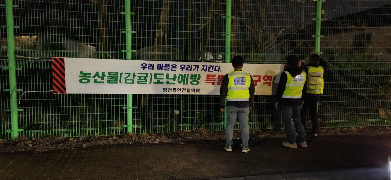 서귀포시 영천동안전협의체(공동위원장 오창림·고광협)은 지난 4일 감귤수확철을 맞아 안전협의체 및 자율방범대 대원 10여명이 참여한 가운데 농산물 절도 범죄예방을 위해 야간 특별순찰을 전개했다.