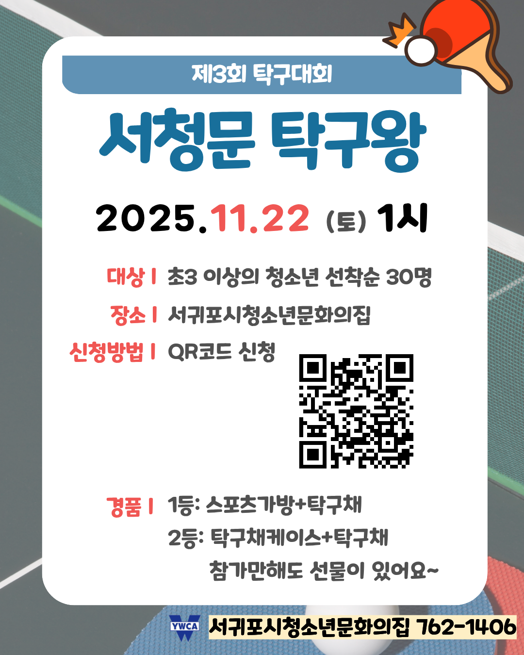 (사)서귀포YWCA(회장 김정미)가 운영하는 서귀포시청소년문화의집(관장 강하자)은 오는 22일 토요일 오후 1시, 서귀포시청소년문화의집에서 열리는 ‘제3회 서청문 탁구왕’ 대회 참가 청소년을 모집한다.