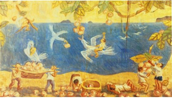 이중섭의 대표작 중 하나인 ‘서귀포의 환상’을 마주하면 절로 미소가 지어진다. 캔버스를 채우고 있는 구김살 없이 장난스러운 몸짓을 한 어린아이들과 커다란 새, 먹음직스러운 복숭아. 해맑은 웃음소리와 복사꽃 향기가 뿜어져 나오는 그림이다.