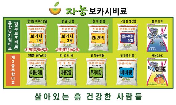 자농보카시비료에는 동물성 유기질인 골분과 어분, 식물성 유기질인 채종유박 등을 혼합한 자농보카시 1호와 3호, 미생물배양효소 등을 혼합한 제3종복합비료인 자농CPK, 고급 유기질과 유효미생물군 등을 발효한 블루미인 등의 제품을 생산‧판매하고 있다.