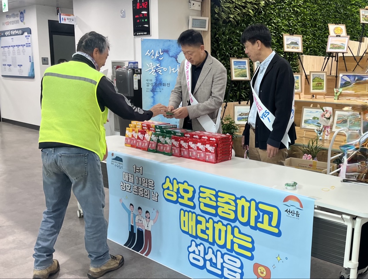 서귀포시 성산읍(읍장 김경범)은 지난 11일 ‘상호존중의 날’을 맞이해 성산읍 직원 및 기간제근로자를 대상으로 상호존중과 배려문화 확산을 위한 캠페인을 실시했다.