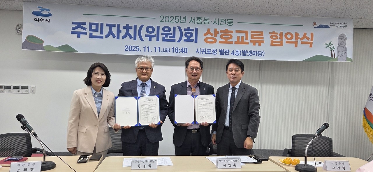 서귀포시 서홍동주민자치위원회(위원장 한봉석)는 지난 11일 서귀포시청 별관 4층 별넷마당에서 전라남도 여수시 시전동 주민자치회와 상호교류 협약을 맺었다. 이날 협약식에는 서홍동주민자치위원회, 시전동주민자치회 등 70여 명이 참석했다.