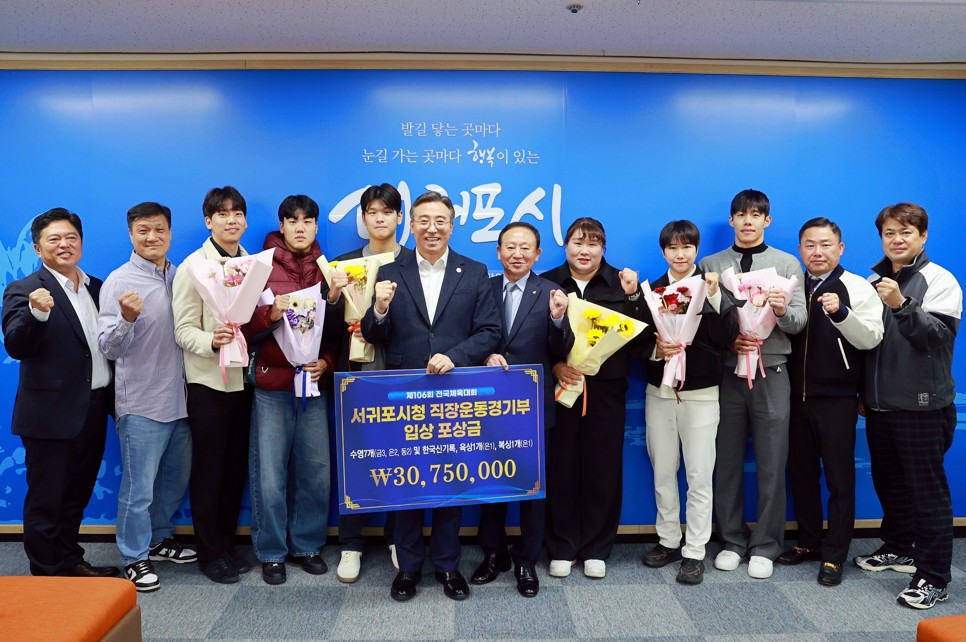 서귀포시가 17일 서귀포시청 직장운동경기부 지도자와 선수, 서귀포시체육회 관계자 등 20여 명이 참석한 가운데 '제106회 전국체육대회' 포상 수여식을 개최하고 우수한 성적을 거둔 선수단의 노고를 격려했다.
