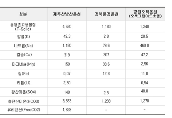 나트륨 또한 1180-79.6-460이며, 위 온천들은 측정조차 미미한 유리탄산 성분도 1628로 나타나 국내 최대치 수준을 자랑한다.