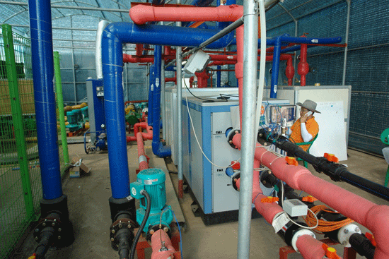 이에 농촌진흥청은 제주도농업기술원과 공동으로 바다로 버려지는 발전소의 온수를 시설원예단지의 난방에 사용하는 시스템을 개발했다. 화력발전소 냉각수인 바닷물 온배수조에 열회수 장치를 설치하고 거둬들인 22~32℃의 담수를 히트펌프에 끌어온다. 이어 물 온도를 55~65℃까지 높인 뒤 이 온수를 따뜻한 바람을 내는 팬을 통과하도록 해 시설하우스 공기를 덥히는 방식이다.